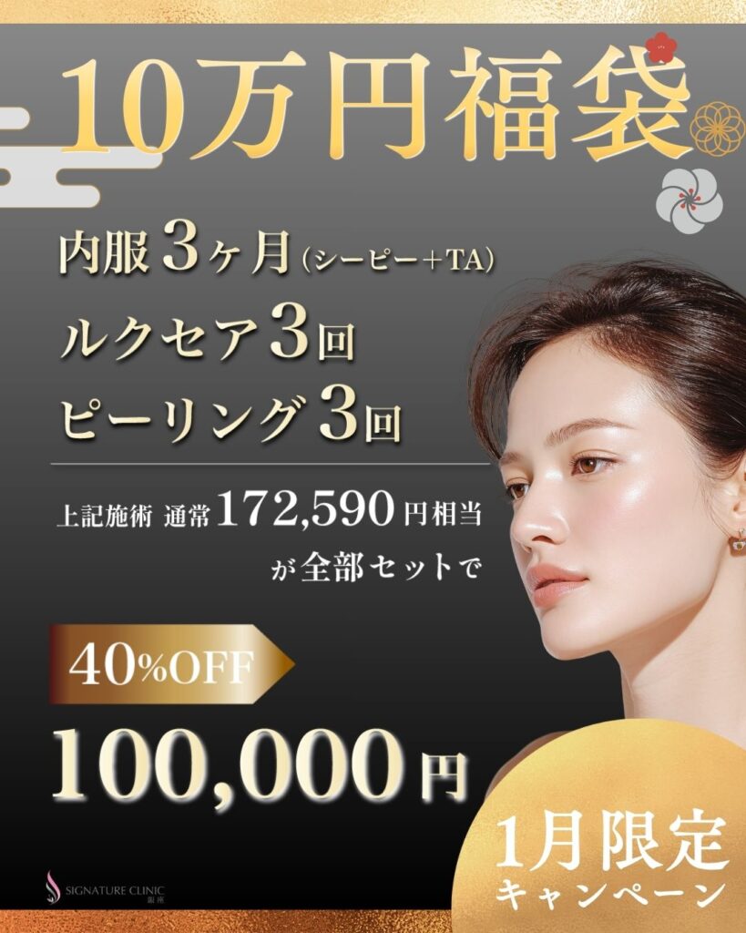 💎 内服3ヶ月(シーピー+TA) 💎 ルクセア 3回 💎 ピーリング 3回 全てセットで… 定価:¥172,590 → ¥100,000 (40%OFF) 🎁