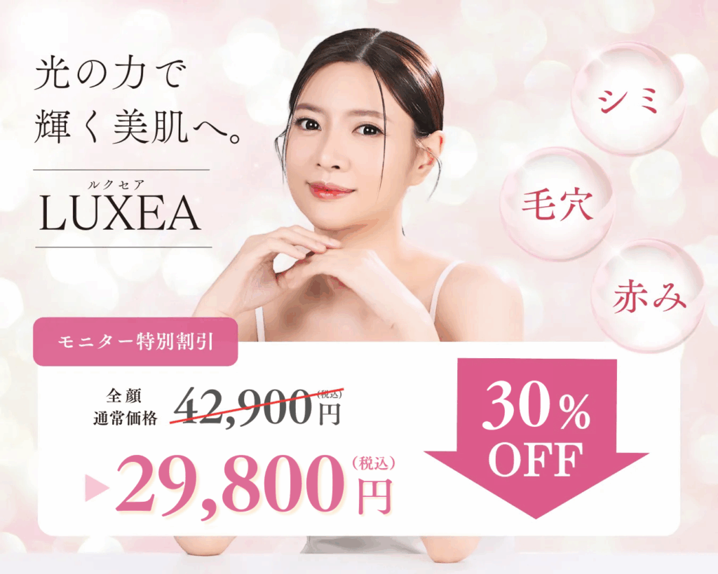 ルクセアは、UPL(U字型パルス光)という特殊な光を肌全体に照射します。これにより、シミだけでなく、毛穴の開きや赤み、くすみなど、肌のハリなど、様々な悩みを同時にケアすることができます。1度の施術で総合的な美肌効果が期待できます。
